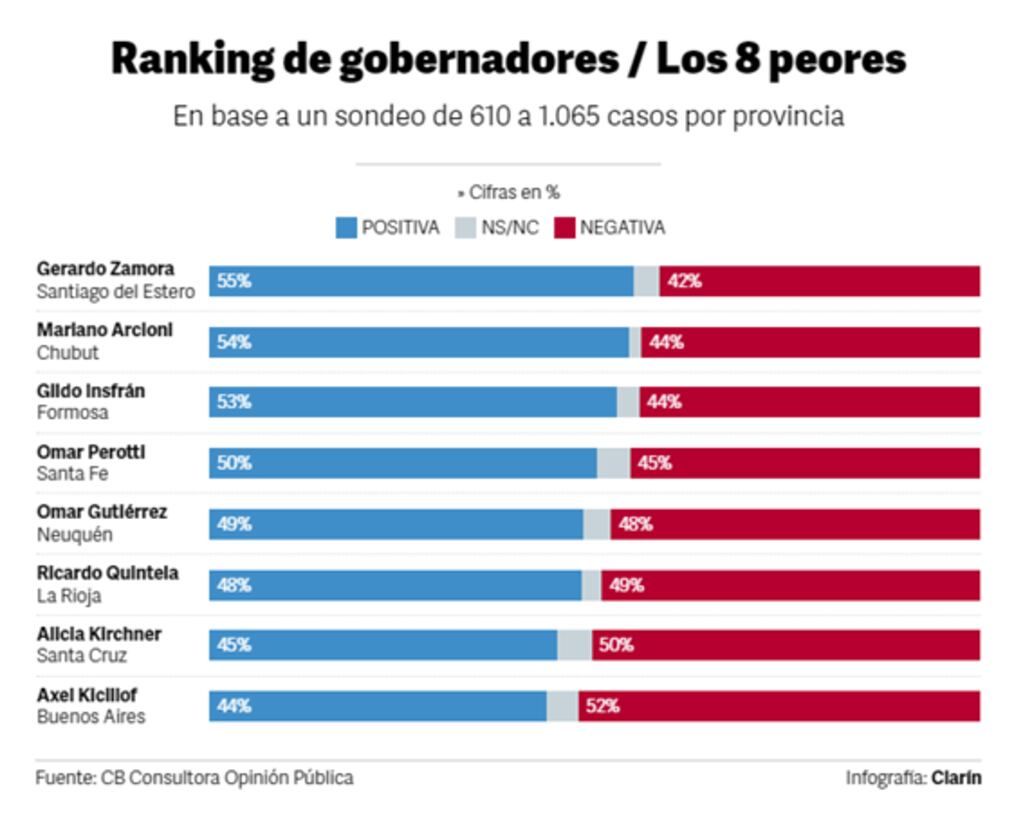 Entre los peores están Axel Kicillof y Alicia Kirchner. Además de ellos, el otro mandatario que tuvo balance deficitario fue Ricardo Quintela, ahora también cristinista. El bonaerense terminó con 43,7% de ponderación positiva y 52,1% de negativa; la cuñada de Cristina con + 45,2% y - 50,4%; y el riojano con + 48,3% y - 49,1%.