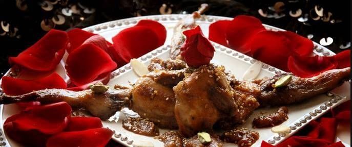 Cortar la pechuga de pollo en trozos medianos, y freirlos en una sartén con un poco de aceite de oliva hasta que se doren. Agregar la sal, el azúcar y la canela en las proporciones estimadas en la receta, y pétalos de rosa al gusto.