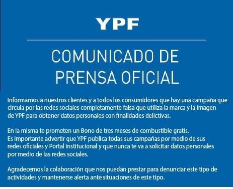 Frente a esta situación desde YPF emitieron un comunicado oficial que desmiente esta falsa información: