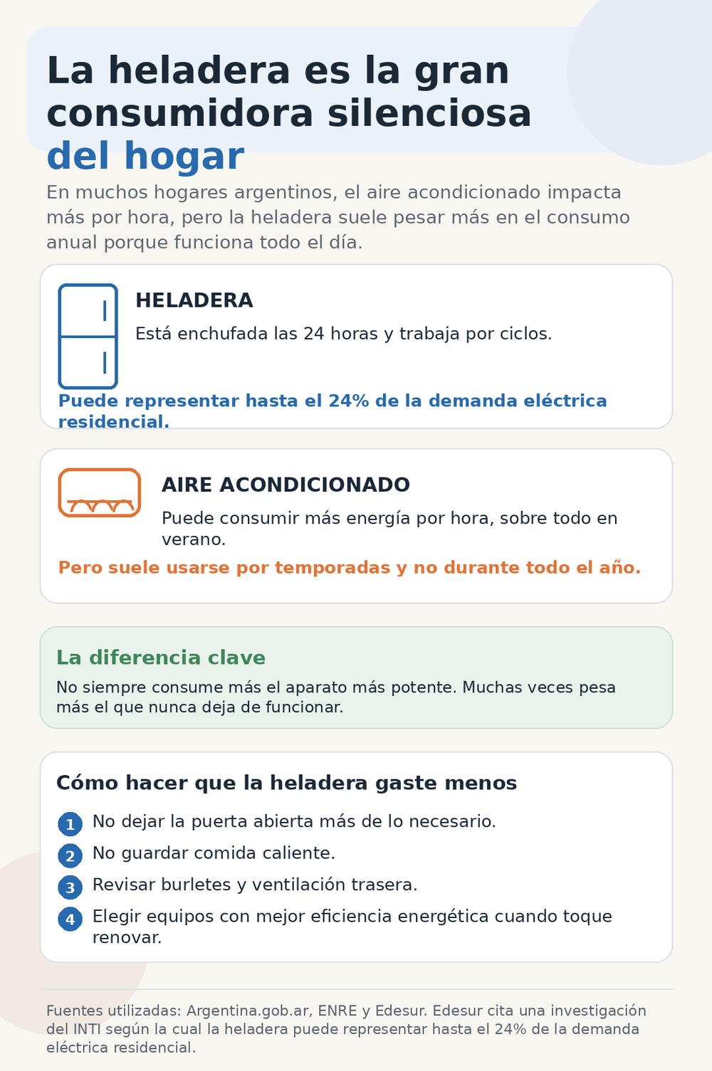 El aire se usa por temporadas y durante ciertas horas, mientras que la heladera trabaja todo el año. Por eso, en el balance final, suele ocupar un lugar más pesado en el consumo doméstico.
