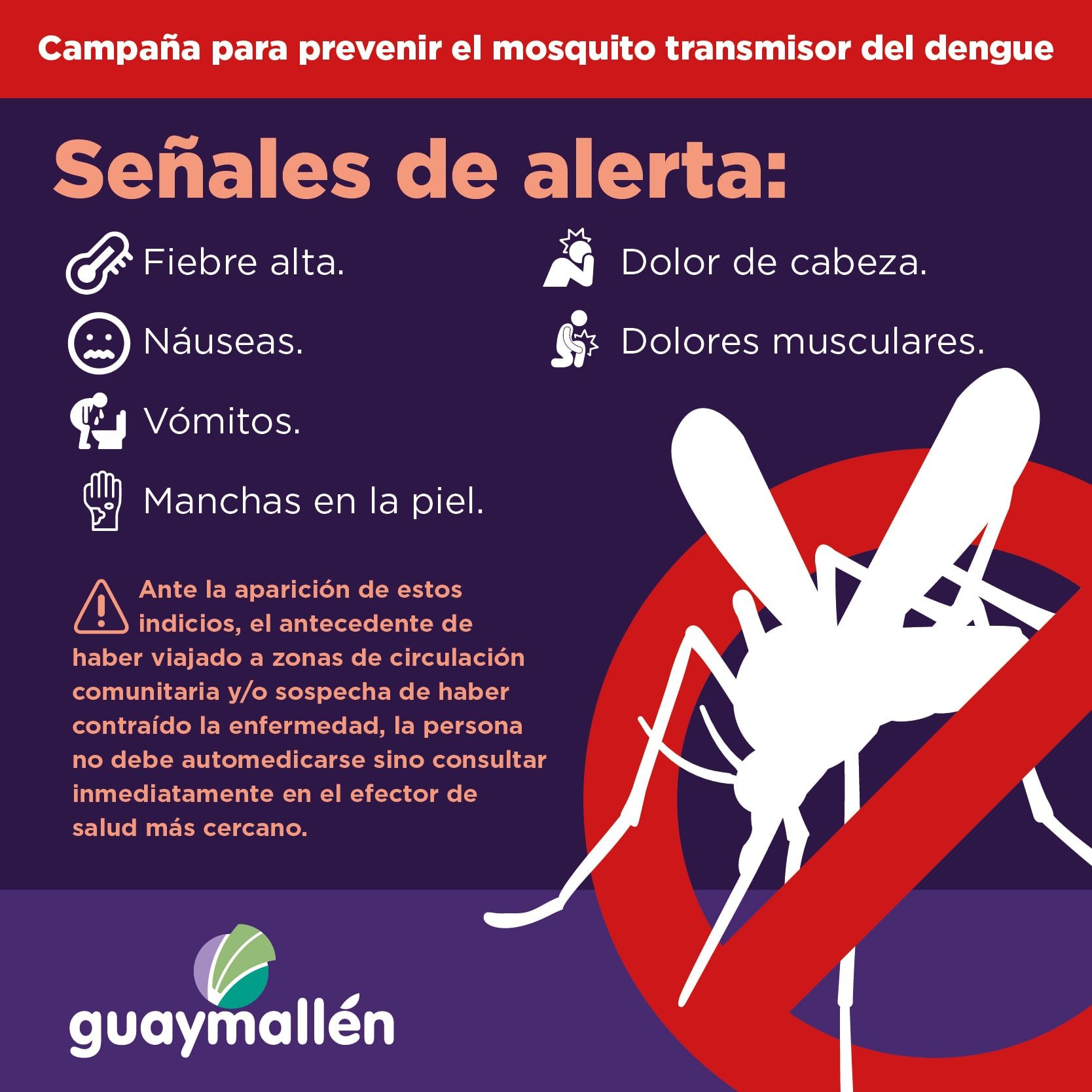 El dengue puede provocar síntomas como: fiebre alta, dolor de cabeza, dolores musculares, náuseas, vómitos y manchas en la piel. Ante la aparición de estos indicios, el antecedente de haber viajado a zonas de circulación comunitaria y/o la sospecha de haber contraído la enfermedad, la persona no debe automedicarse sino consultar inmediatamente en el efector de salud más cercano.