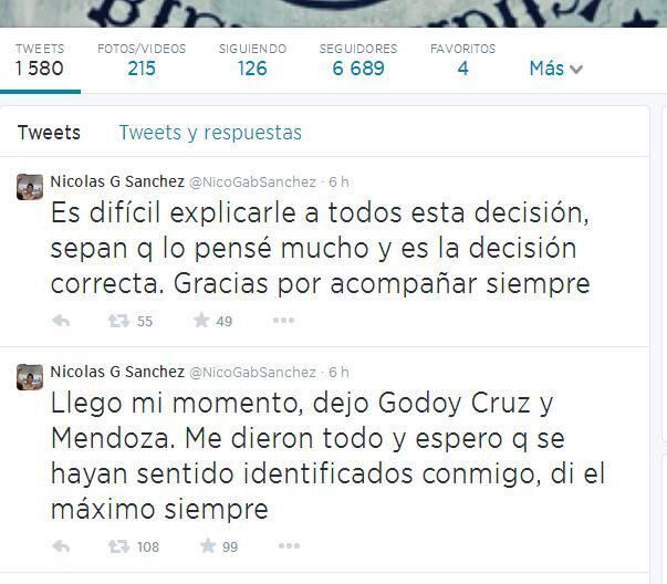 El defensor central Nicolás Sánchez comunicó a través de la red social Twitter que se alejará de Godoy Cruz tras una larga estadía en la provincia de Mendoza. Su próximo destino, casi con seguridad, sería Racing Club de Avellaneda, institución que también cerró la contratación de otro ex defensor del Expreso, Leandro Grimi.