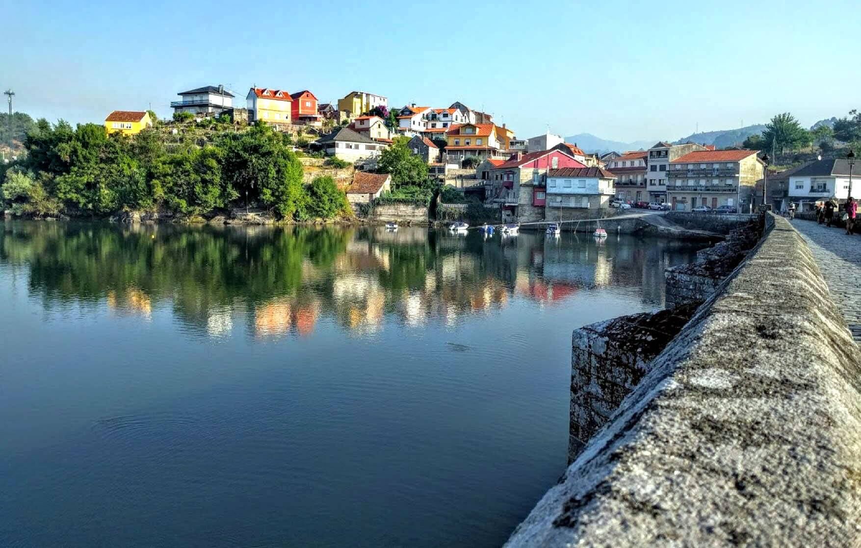 Más adelante y sin aviso se aparecen las arcadas medievales del Ponte Sampaio, escenario de la batalla del mismo nombre que el pueblo español libró contra el invasor francés en 1809. El paisaje de la magnífica vista de la Peneda del Viso y la desembocadura del río Verdugo, se refleja acuarelado en el río y aunque acabamos de hacer una parada, este stop no lo exige el cuerpo sino el escenario: admirarlo, imprimirlo en la retina y llevarlo para siempre en la memoria. Me pregunto si el peregrino chino habrá apartado la vista de su guía.