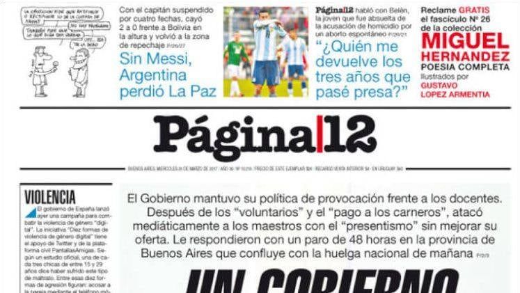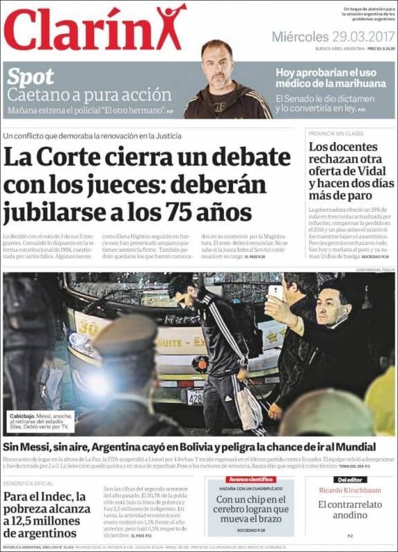 El diario "Clarín" dedicó media portada a la selección, con una foto de Messi retirándose cabizbajo del estadio Hernando Siles de La Paz. "Sin Messi, sin aire, Argentina cayó en Bolivia y peligra la chance de ir al Mundial".