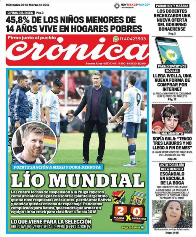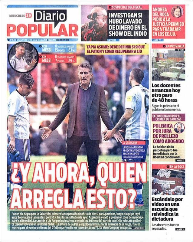 Las críticas se reiteraron en todos los medios. "Sin Messi, Argentina perdió La Paz", tituló el diario "Página/12", mientras que "Diario Popular" preguntó: "¿Y ahora quién arregla esto?". "Lío Mundial", encabezó por su parte "Crónica".