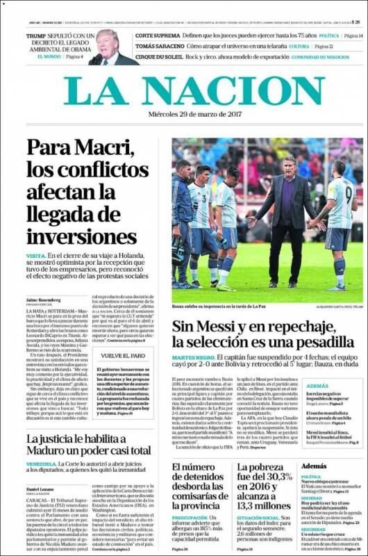 "Sin Messi y en repechaje, la selección es una pesadilla", afirmó el diario "La Nación" en su portada, donde señaló que Argentina enfrenta "el peor escenario rumbo a Rusia 2018".