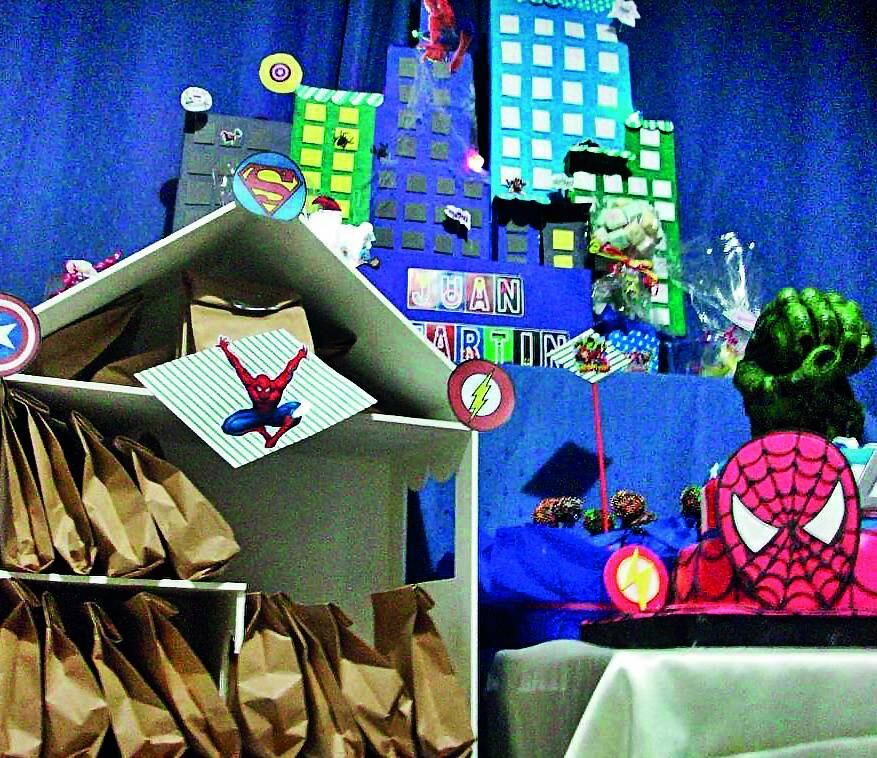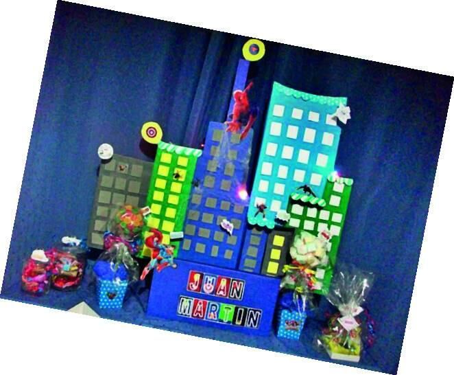Para sorprender a todos los invitados, se realizó una maqueta para poner en la mesa dulce. Se utilizó telgopor forrado con cartulina y goma eva simulando los edificios de la ciudad, se agregaron luces, telas de araña, arañas, onomatopeyas en cartulina con resortes saliendo de las ventanas, logos y las figuras de los supehéroes. También, se escribió el nombre del cumpleañero para personalizar la mesa que estaba repleta de cosas ricas e innovadoras.