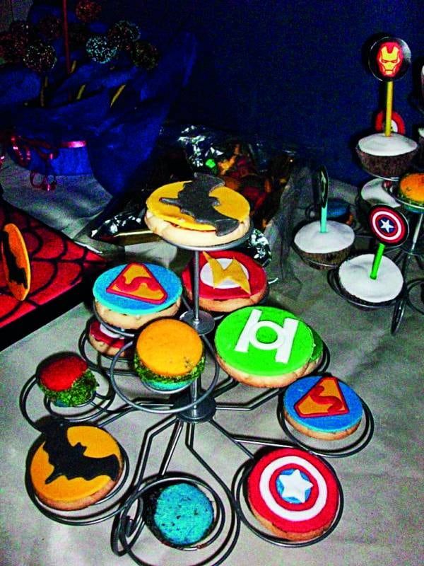La mesa estaba repleta de cake pops bañados en chocolate, a los que se les colocó capitas. Además, cupcakes con el logo de cada superhéroe, topiarios con marshmallows y gomitas, frascos con mix de golosinas, trufas simulando ser bombas, alfajorcitos de maicena teñidos en diferentes colores y la super torta en dos pisos con todos los personajes presentes.