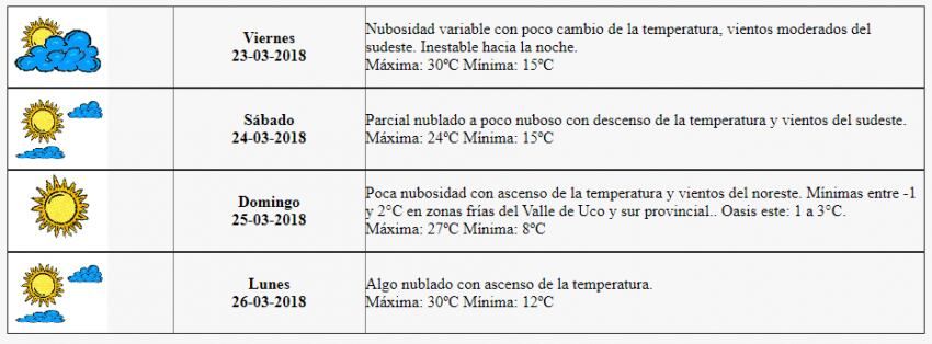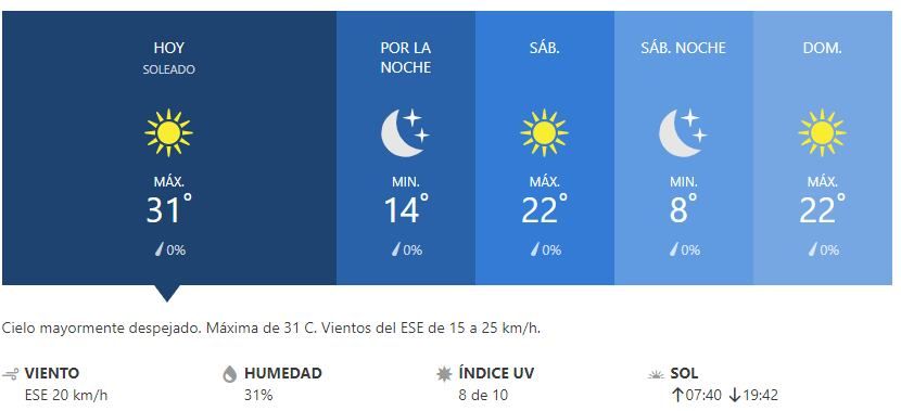Para el fin de semana el pronóstico extendido indica una disminución de la temperatura. El sábado se espera poca nubosidad con descenso de la temperatura y vientos del sudeste. La máxima será de 24ºC y la mínima, de 15ºC.