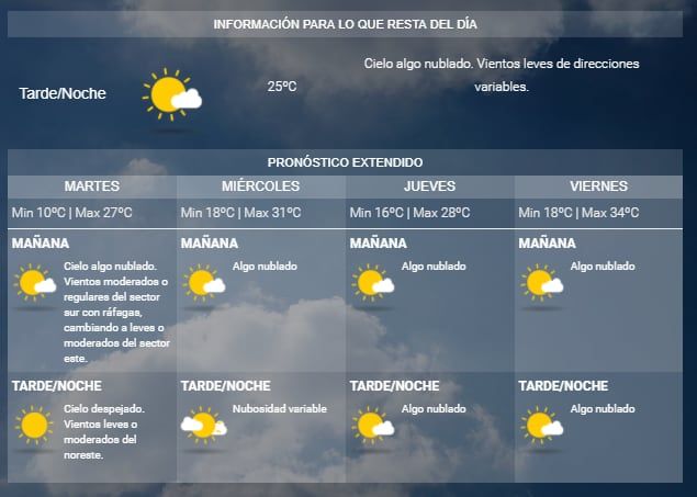 De acuerdo al pronóstico del Servicio Meteorológico Nacional, por la mañana el cielo se presentará “algo nublado”. Además, se registrarán vientos moderados del sector Sur con ráfagas durante la mañana y cambiarán a leves desde el sector Este hacia el mediodía.
