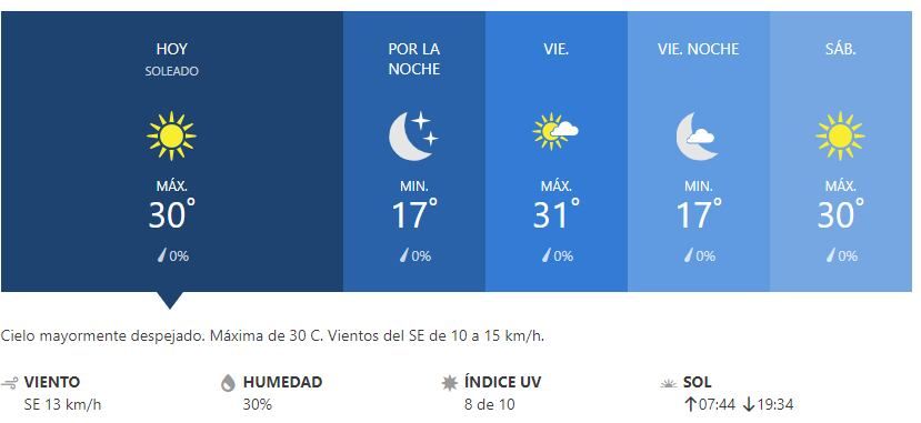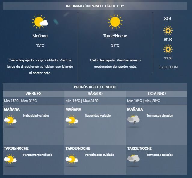El cielo estará despejado y la amplitud térmica será marcada durante este jueves. La mínima será de 13 grados, pero la temperatura máxima subirá a los 31 grados en la tarde, informó el Servicio Meteorológico Nacional.