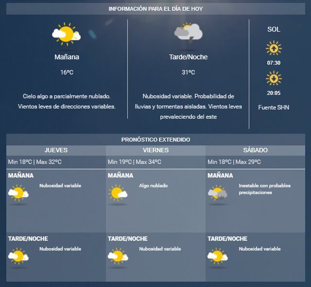 Para hoy se espera que la temperatura máxima llegue a los 31 grados. Estará nublado por la mañana e inestable con probables precipitaciones por la tarde/noche según el Servicio Meteorológico Nacional.