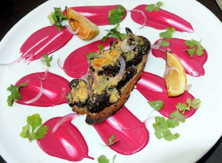 Por otra parte, cortar una rebanada generosa de pan integral de semillas y colocar por encima la preparación de hongos. Espolvorear con el queso reggianito y llevar a la salamandra o en horno muy fuerte para que se gratine. Servir con la cebolla morada y rociar con buen aceite de oliva extra virgen.