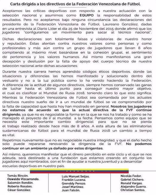 Tomás Rincón, Oswaldo Vizcarrondo, Salomón Rondón, Roberto Rosales, César González, Luis Manuel Seijas, Franklin Lucena, Grenndy Perozo, Josef Martínez, Juan Falcón, Nicolás Fedor, Gabriel Cichero, Ronald Vargas, Alejandro Guerra y Christian Santos firmaron el comunicado de dimisión repudiando las declaraciones del presidente de la Federación.