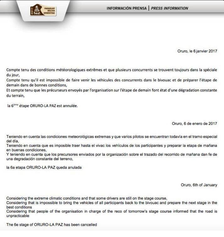 " Y teniendo en cuenta que los precursores enviados por la organización sobre el trazado del recorrido de mañana dan fe de una degradación constante del terreno, la sexta etapa Oruro-La Paz queda anulada", añade el comunicado de los organizadores del Dakar.