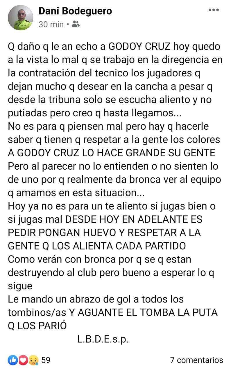 La peor parte es el "mensaje" para los jugadores que deja en el segundo párrafo: "No es para que piensen mal pero hay que hacerle saber que tienen que respetar a la gente, los colores... A GODOY CRUZ LO HACE GRANDE SU GENTE pero al parecer no lo entienden o no sienten lo que uno porque realmente da bronca ver al equipo en esta situación".