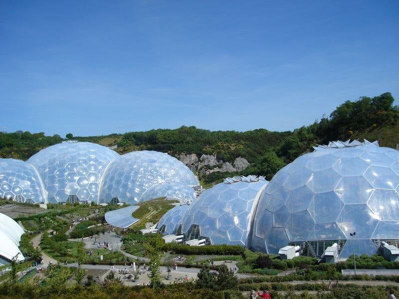 Ideado por Nicholas Grimshaw. Son cúpulas geodésicas como burbujitas creando formas orgánicas que reproducen una síntesis de funcionalidad, estética y economicidad típica de las formas naturales.