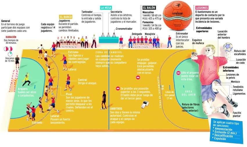 El balonmano se juega con la mano (siempre que se golpee la pelota con el pie se sanciona con golpe franco) y que consiste en lograr marcar más goles que el equipo rival.