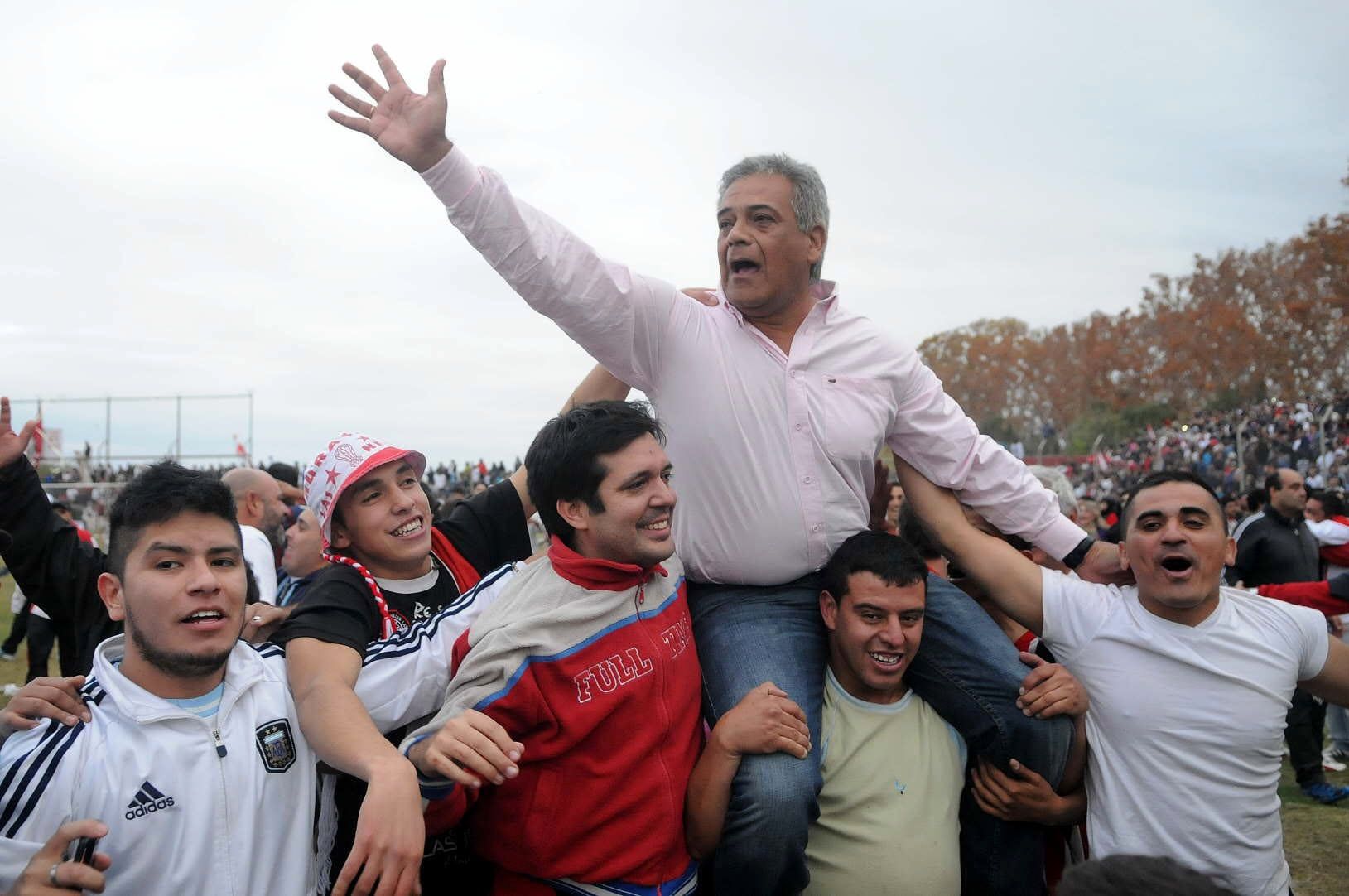 El técnico Aldo Bolado es llevado en andas por los hinchas (domingo 27 de abril de 2014) cuando Huracán LH logró el ascenso a Argentino B (hoy Federal B). Fue el segundo ascenso del Globo. El anterior fue en Tucumán con Luis Sperdutti como DT.