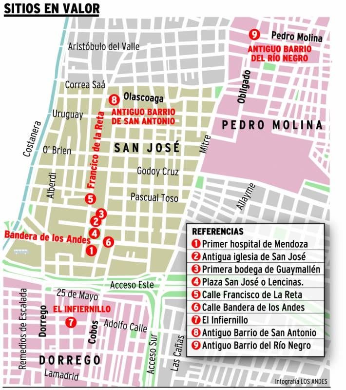 A grandes rasgos, las zonas donde se ubicaron estas construcciones o referencias históricas son San José, en torno de la plaza homónima; Dorrego, donde se ubicaba El Infiernillo, la calle Pedro Molina y lo conocido como la Media Luna. El escrito detalla la relevancia de cada espacio elegido
