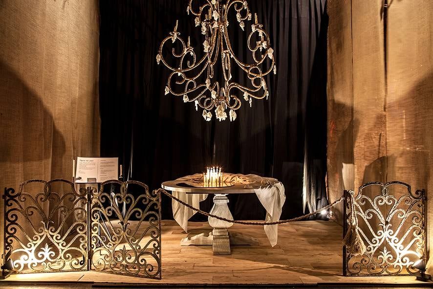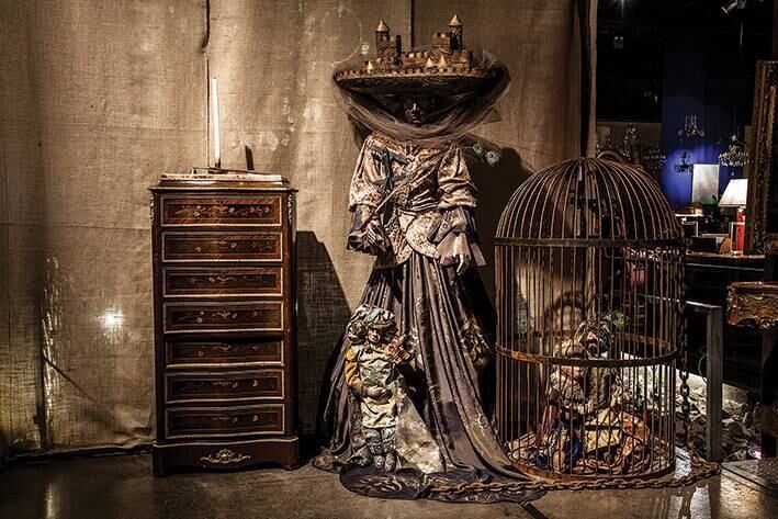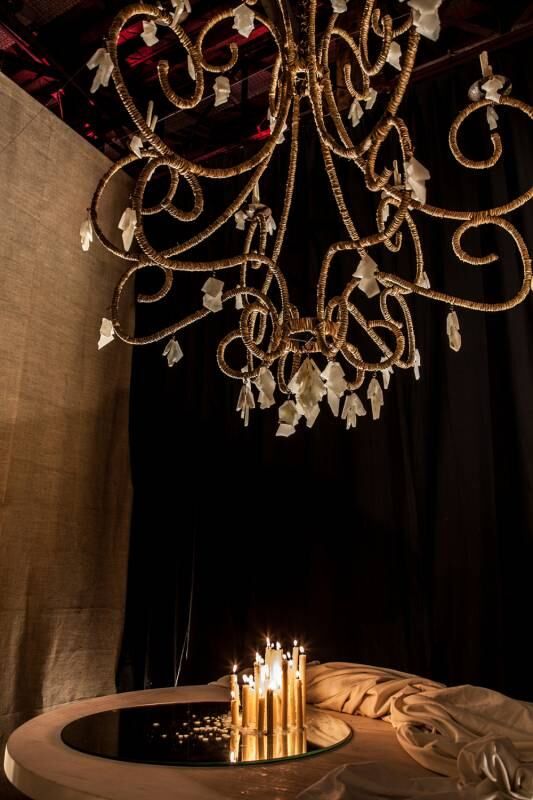 La instalación escenográfica está dominada por la colosal araña armada a medida. El conjunto llena de poesía el espacio, que se transmite a través de la iluminación y los materiales seleccionados; por Luisa Yanzón.