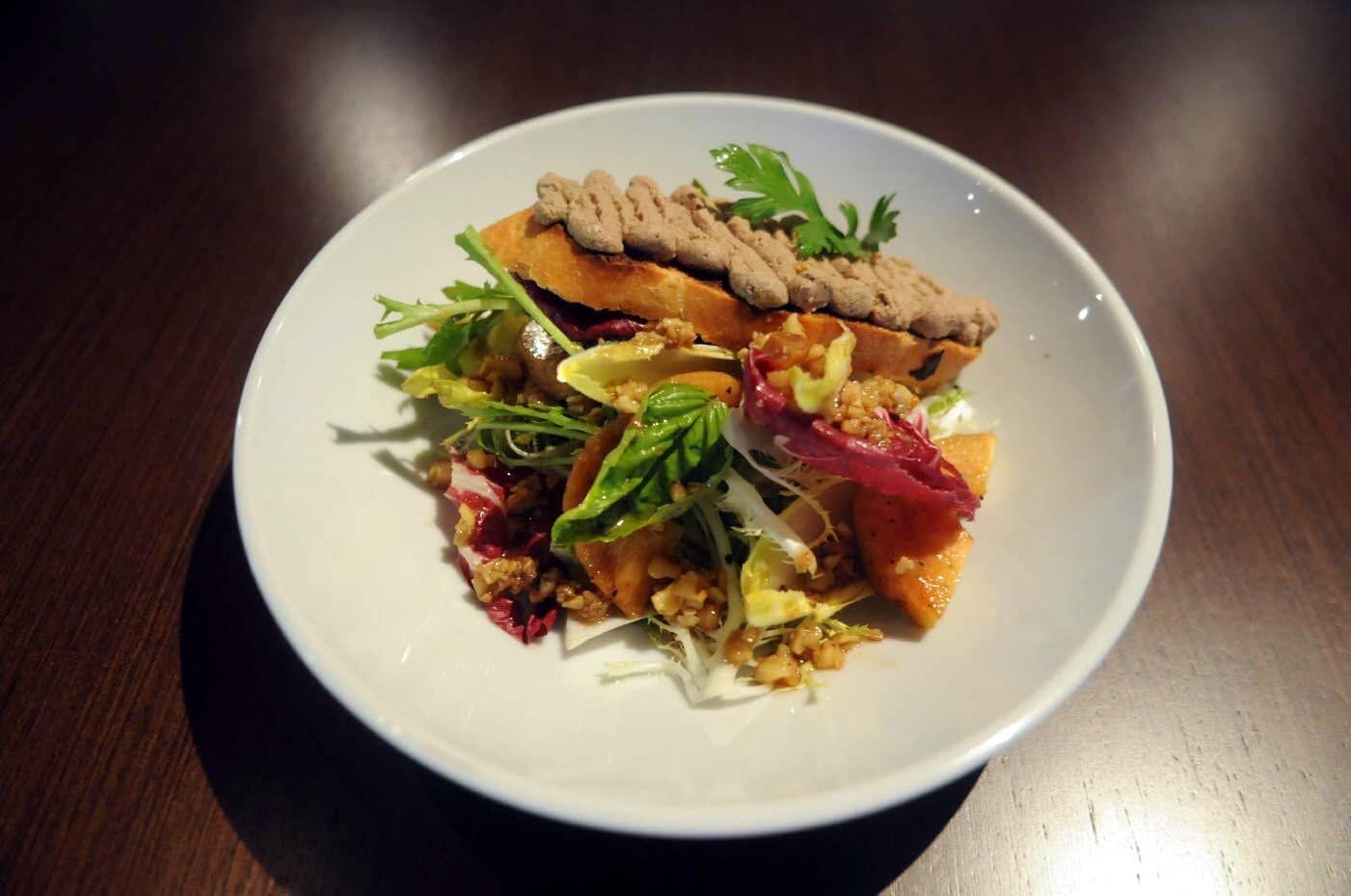 Armado: Limpiar los verdes y reservar. Pelar y grillar la manzana, tostar el mix de frutos secos y picar de groso modo. Hacer una vinagreta con el aceto, aceite de oliva y los frutos secos. Mezclar los ingredientes en un bowl y condimentar con la vinagreta. Preparar una tostada, colocar una buena cantidad de paté y presentar junto con la ensalada.