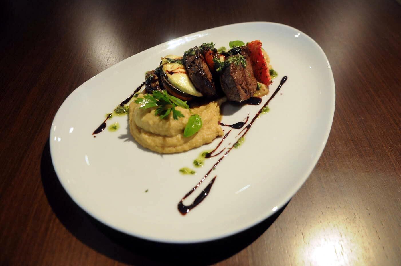 Tagliata de lomo zucchini, berenjena, tomate y polpetta con puré de cebollas confitadas, reducción de vino y pesto de albahaca