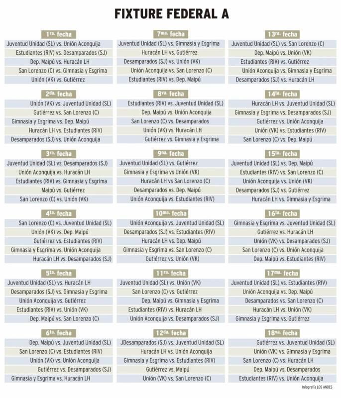Este miércoles se conoció el fixture oficial del Federal A 2017. Este año serán cuatro los equipos mendocinos que formarán parte del torneo que dará ascensos a la B Nacional. Gimnasia y Esgrima, Gutiérrez SC, Dep. Maipú y Huracán Las Heras serán los representantes de la Liga Mendocina.