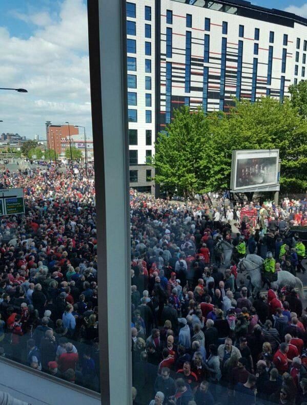 Alrededor de 20 mil espectadores de las gradas 'Stretford End' y 'Sir Alex Ferguson Stand' fueron evacuados por la policía. En principio se había anunciado que el partido sería retrasado 45 minutos. Así lo decidió el árbitro del partido, Jonathan Moss, tras hablar con el delegado del Manchester, quien le dijo que había “un incidente en algún lugar del estadio”.