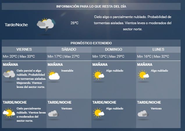 En tanto, este sábado será una jornada con nubosidad variable y tormentas aisladas, que traerán un descenso de la temperatura. La máxima se prevé en 31 grados.