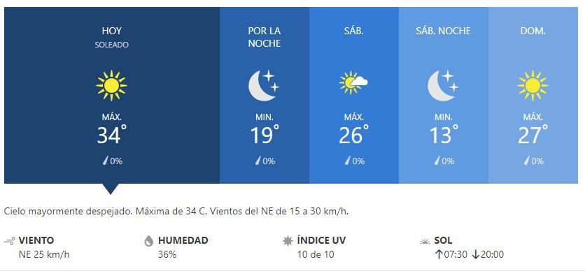 El domingo habrá tiempo bueno con poco cambio de la temperatura y vientos del noreste. La temperatura máxima será de 29 grados.