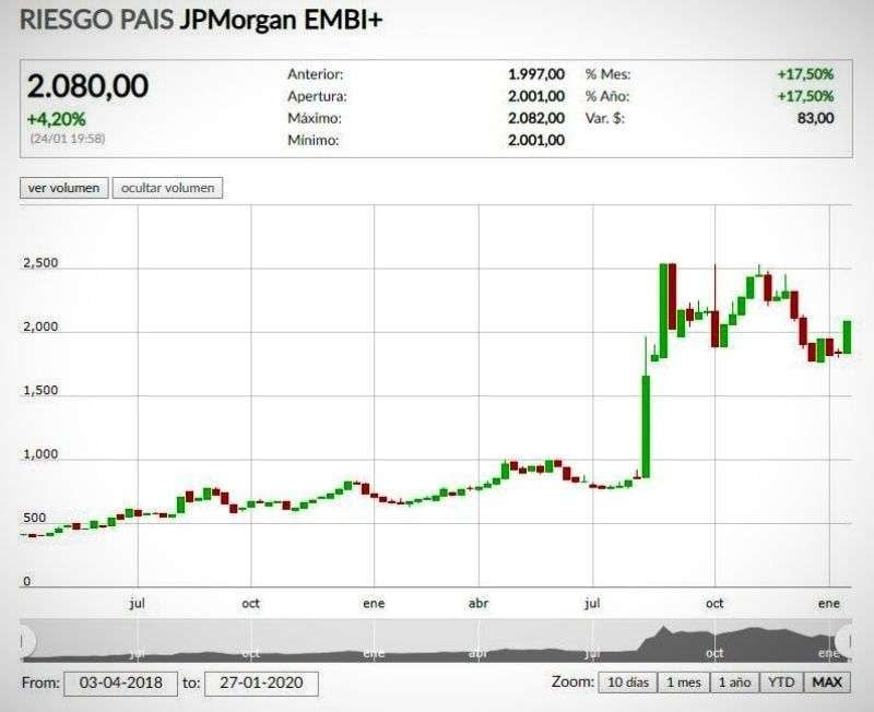 Esta semana el riesgo país volvió a ser noticia en Argentina ya que superó, de nuevo, la barrera de los 2000 puntos. El indicador que mide JP Morgan cerró la semana en 2080 puntos, su valor más alto desde mediados de diciembre pasado.