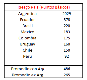 Por otro lado, si se calcula el promedio del riesgo país en la región incluyendo a Argentina, se observa que el mismo es de 486 puntos. Por lo tanto, la prima de riesgo local es más de cuatro veces mayor que el promedio de la región.