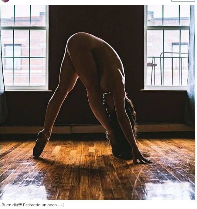Luego vino la imágen de una joven elongando sin nada de nada de ropa. Sólo las zapatillas de ballet. No se sabe bien si es ella. La cara no se puede ver claramente. No sería, de todas maneras, la primera vez que la actriz decide mostrarse sin ropa. La foto en cuestión: