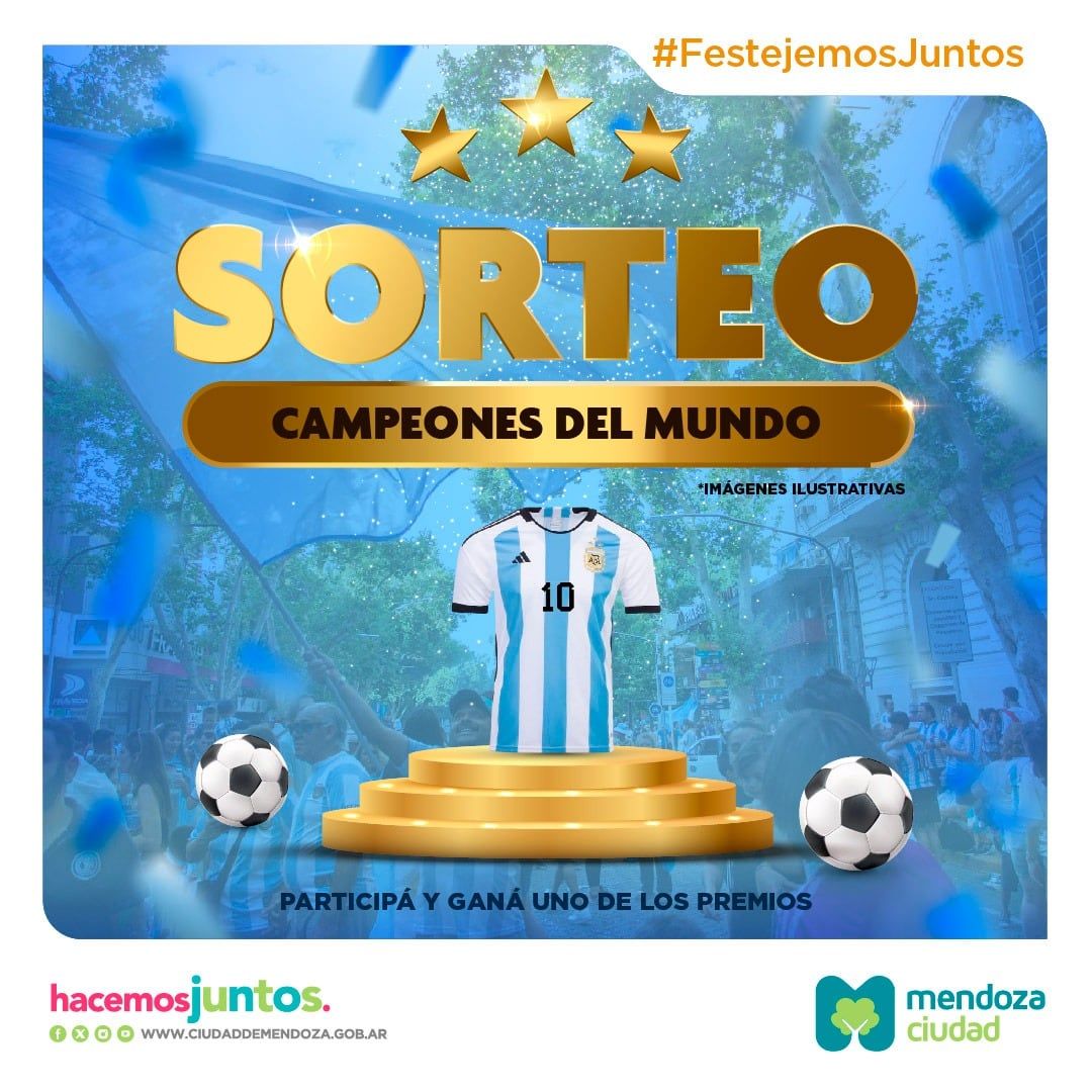 El próximo 18 de diciembre, a través de las red social Instagram del municipio se sortearán 5 camisetas del seleccionado argentino y 5 pelotas de fútbol, y vos podés ser uno de los ganadores. Es sencillo, tenes que realizar los siguientes pasos: seguí a @mendozaciudad, compartí una historia mostrando un recuerdo de tu festejo de aquel día y etiquetá a la cuenta de la Ciudad, completá el formulario con tus datos y ya estás participando.