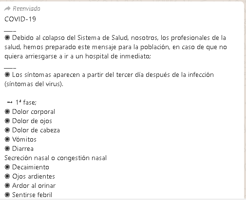 En las últimas horas se han viralizado cadenas en las que aseguran que “los profesionales de la salud, hemos preparado este mensaje para la población, en caso de que no quiera arriesgarse a ir a un hospital de inmediato”. Desde el Ministerio de Salud aclararon que no existe ninguna institución pública o privada brindando este tipo de consejos y que no tienen veracidad.