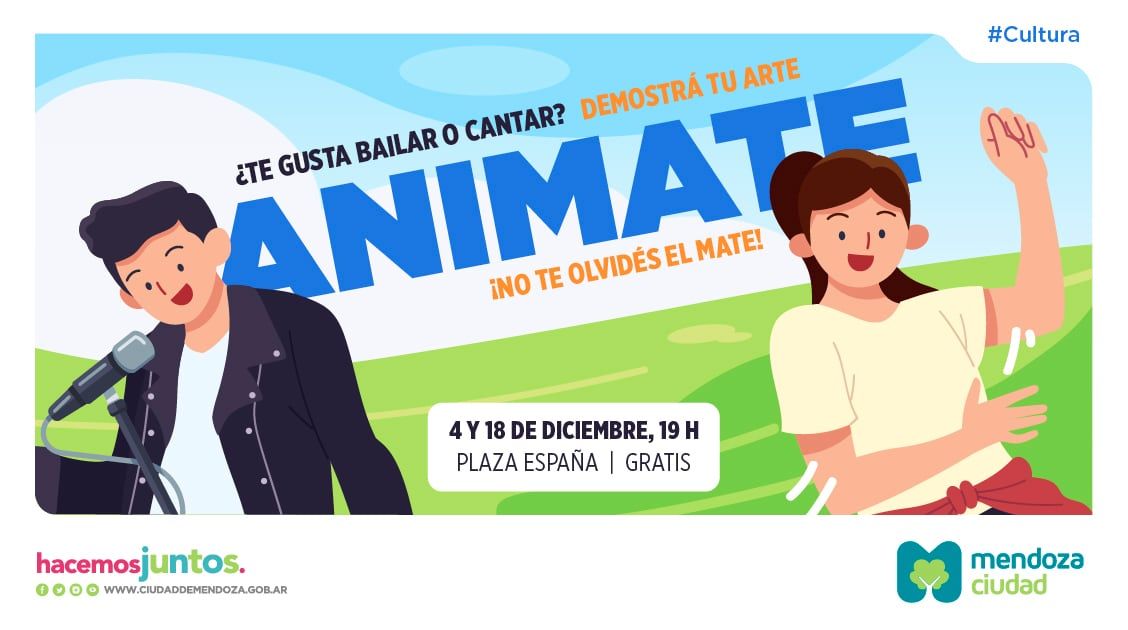 Eso sí, si te animás a mostrarle al público lo que sabés hacer, deberás ser muy puntual y llegar con anticipación a la hora de la cita. Es que, sólo los diez primeros que se anoten podrán ser parte del ciclo “Animate”.Ciudad te invita a que preparés el mate y una mantita para sentarte en la plaza. Alentá el talento mendocino.