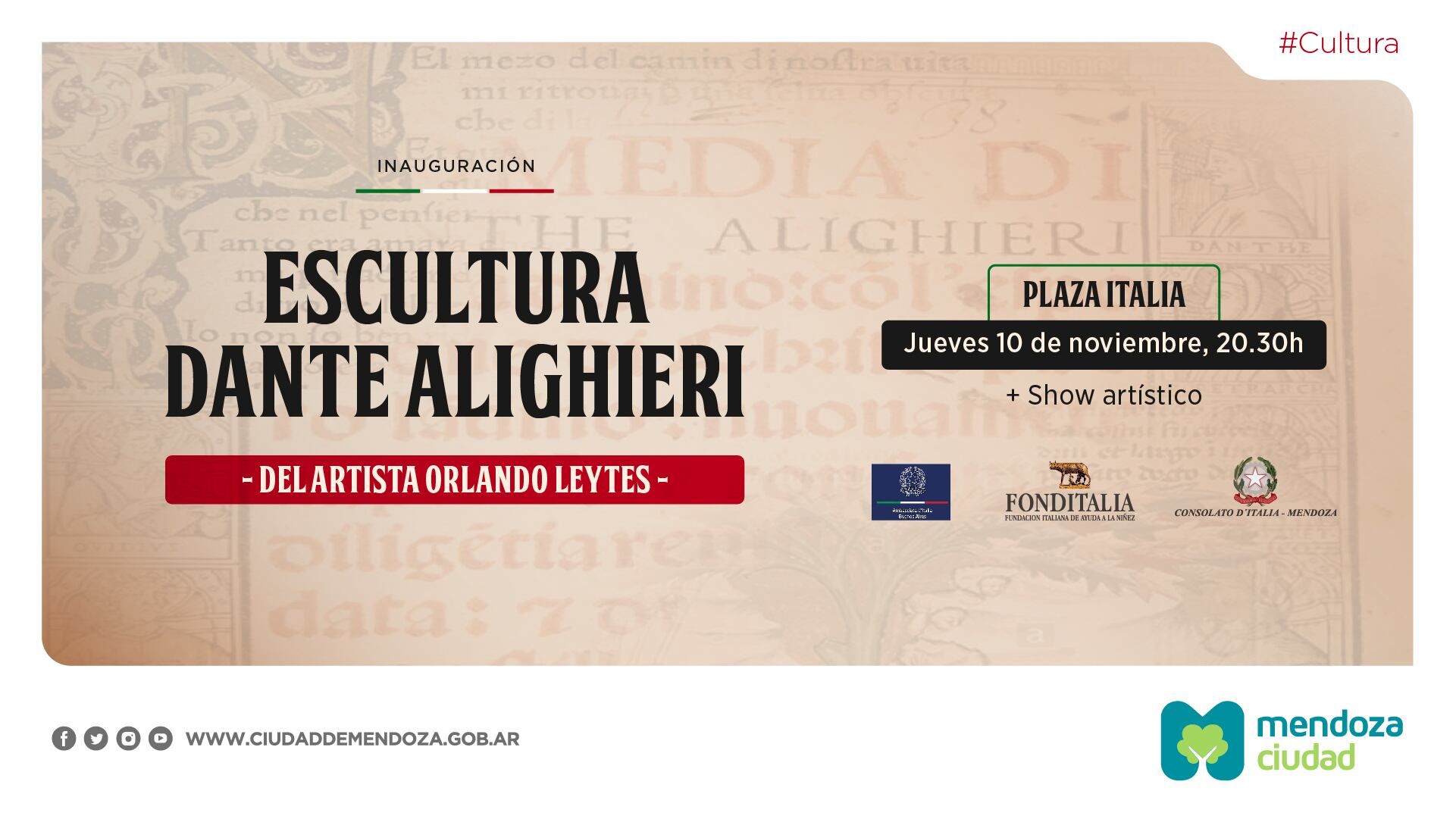 La Ciudad de Mendoza invita a vecinos y vecinas a disfrutar la puesta en valor integral de la plaza Italia, que contará con la inauguración de la fuente central y la escultura Todo por amor, de Orlando Leytes, en homenaje a Dante Alighieri.