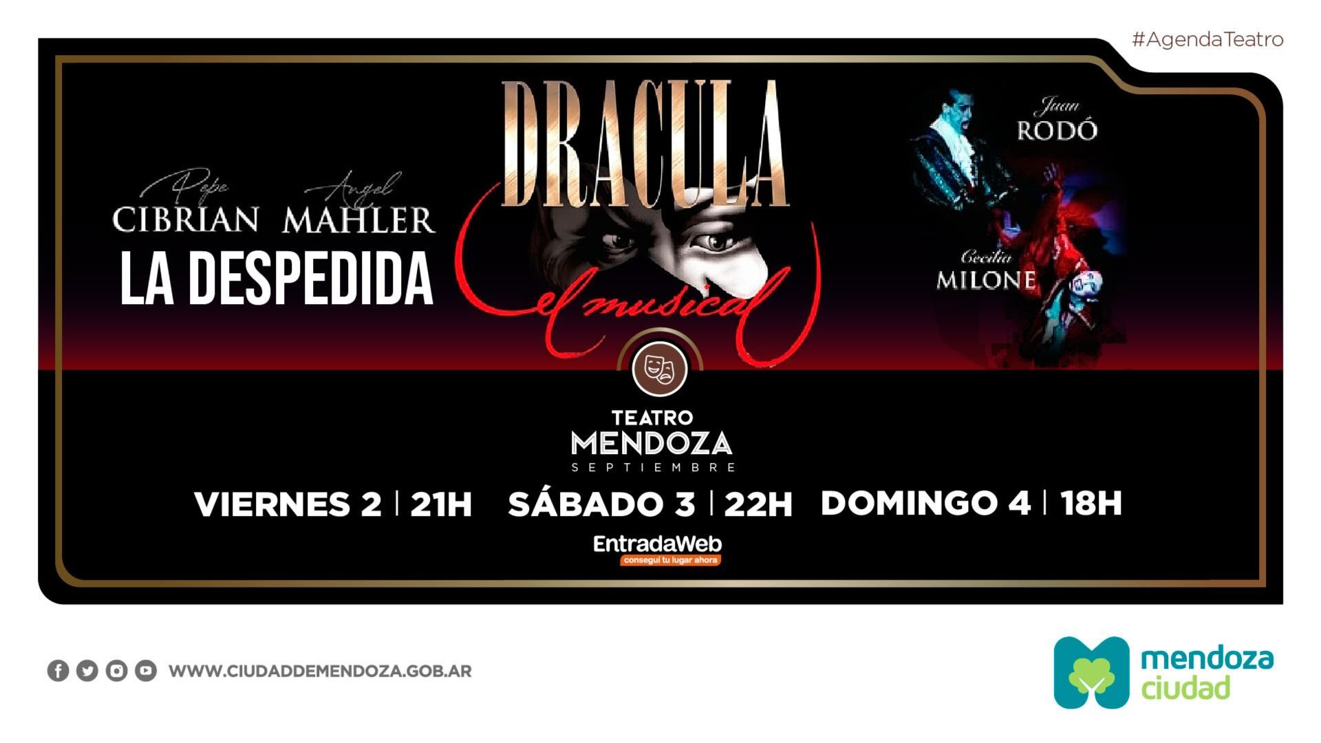 Drácula, el Musical. Entrada: platea baja $6000; palcos altos $5000; platea alta $5000; pullman $4000. Adquirí tu ticket en www.entradaweb.com. Vuelve uno de los musicales argentinos más importantes. Escrito y dirigido por Pepe Cibrián y Ángel Mahler. En esta versión, gran parte del elenco original estará protagonizando los roles principales, tales como Juan Rodó (Drácula), Cecilia Milone (Mina Murray) y un gran elenco. Más de tres millones y medio de personas han visto el musical, en Argentina, Brasil, Chile y España. En abril de este año volvió al escenario donde se estrenó: el mítico Luna Park. La producción promete superar a la original. El elenco será de 25 artistas entre actores, cantantes y bailarines. Será, sin duda, un festejo lleno de emoción.