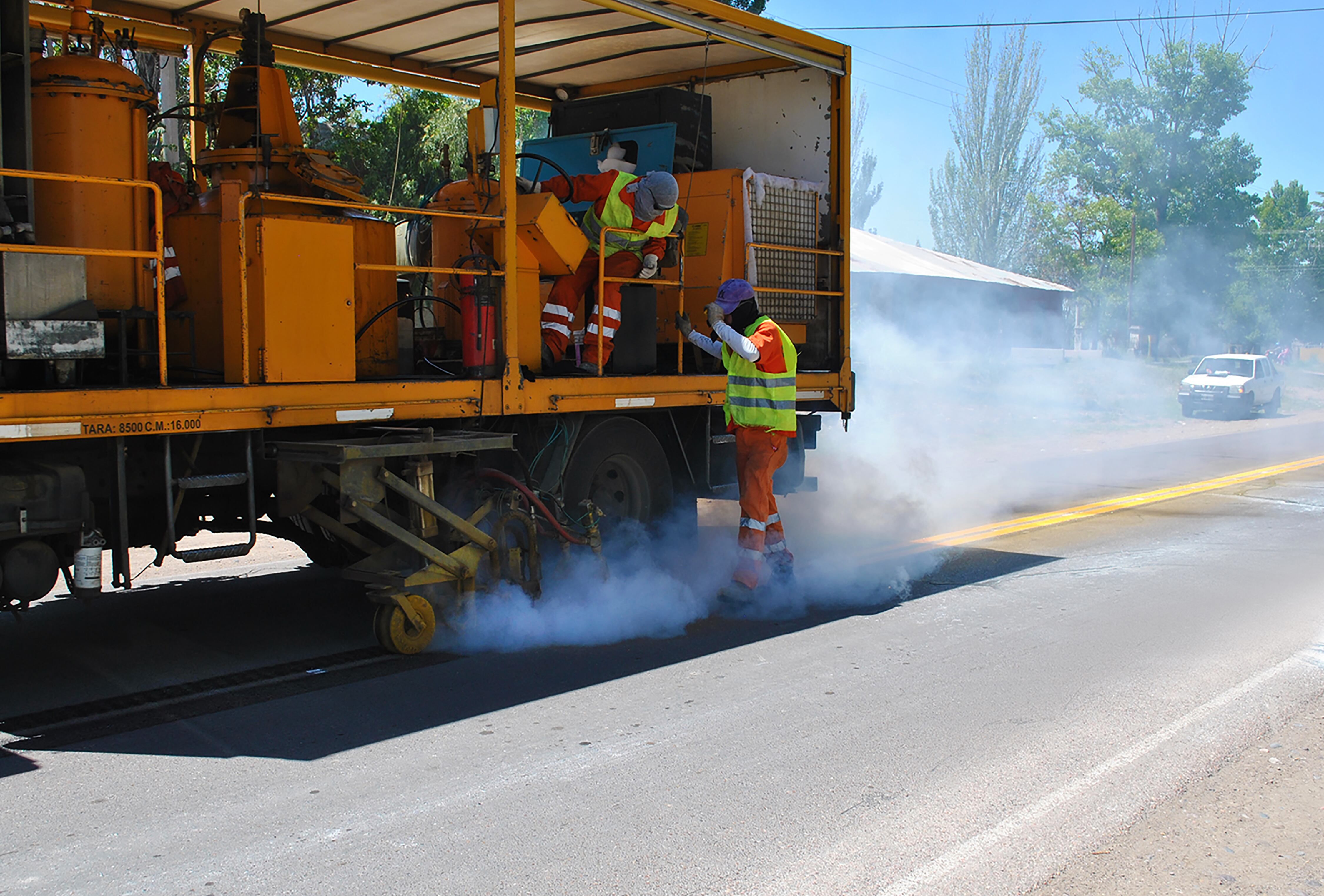 El trabajo de demarcación en caliente, a cargo en este caso de la firma Cleanosol Argentina SA, cuenta con un proceso minucioso que requiere fundir el material termoplástico y las microesferas reflectantes a una temperatura de 210 grados centígrados para luego ser aplicado y definir la doble línea amarilla y las líneas laterales que conforman la traza.