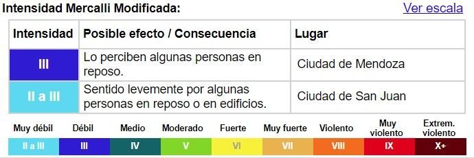 Afortunadamente no se reportaron heridos. En la escala Mercalli midió intensidad III en Mendoza, lo que significa que personas en reposo percibieron el movimiento.