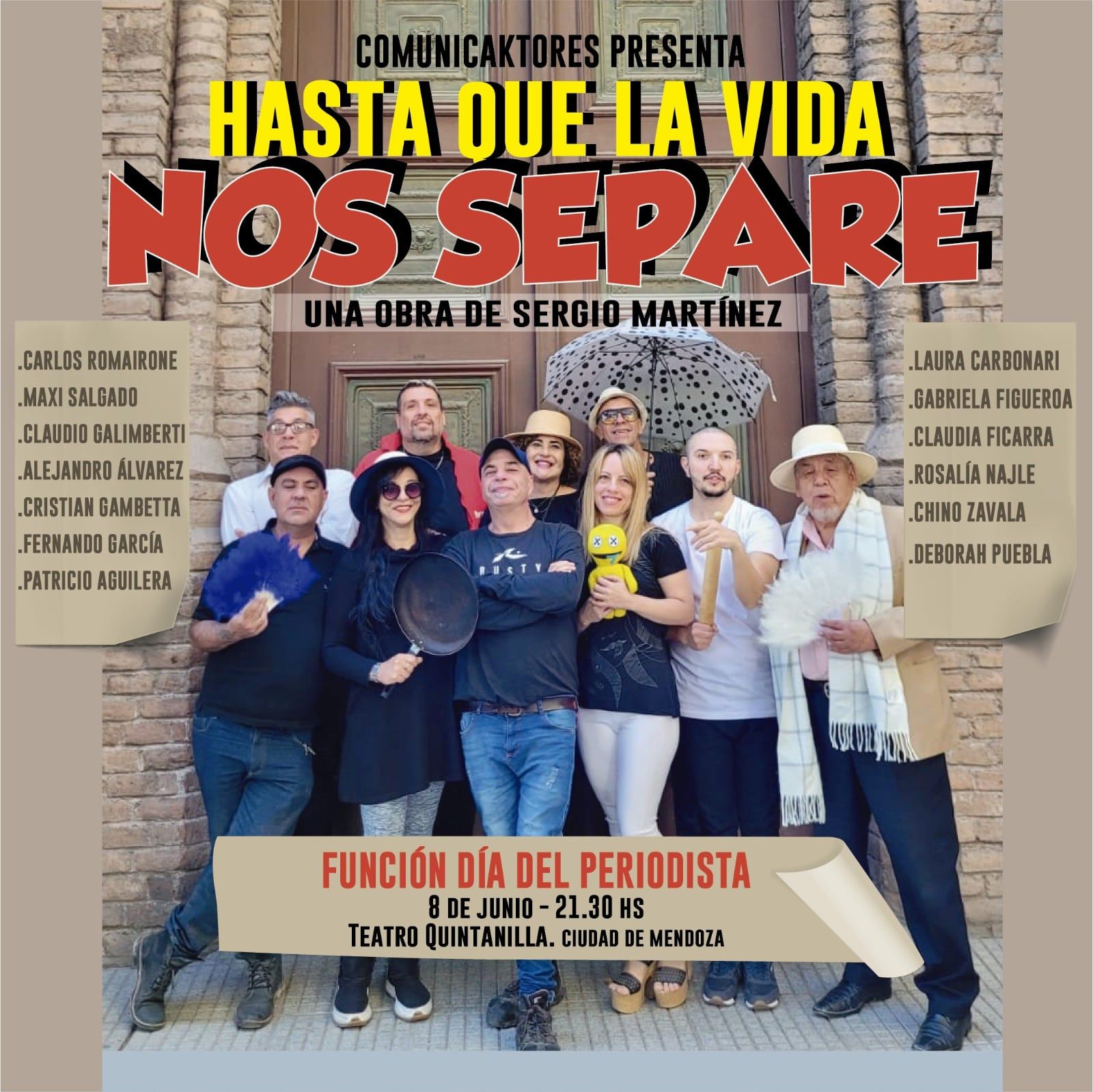 El elenco itinerante y rotativo Comunicaktores, integrado por periodistas y locutores de Mendoza, presenta su nuevo espectáculo “Hasta que la vida nos separe”, el jueves 8 de junio en el Teatro Quintanilla, a las 21.30.