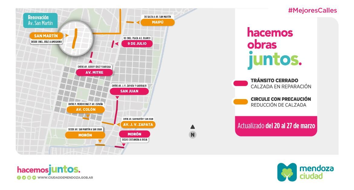 La Ciudad de Mendoza, en el marco del Plan de Obras Urbanas, informa el detalle actualizado de las diferentes arterias de la capital que están siendo intervenidas, en su calzada o veredas, en relación al tránsito vehicular.