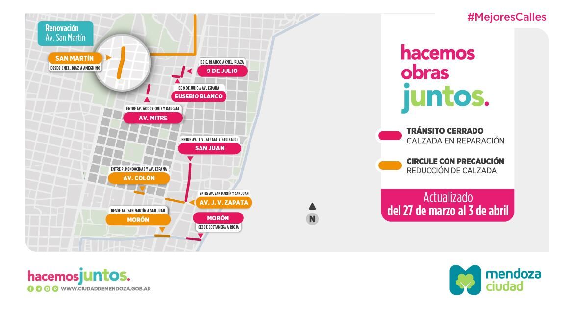 San Martín desde Coronel Díaz - Cadetes Chilenos a Ameghino. Morón, desde San Martín a San Juan. Colón, entre España y Patricias Mendocinas (por obras en veredas). José V. Zapata, entre San Martín y San Juan (por obras en veredas).