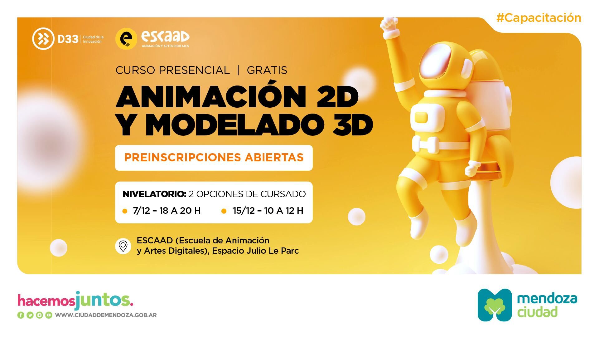 La Municipalidad de la Ciudad de Mendoza junto a la Escuela de Animación y Artes Digitales (ESCAAD) se unen para llevar a cabo una novedosa capacitación en Animación 2D y Modelado 3D, totalmente gratuita.