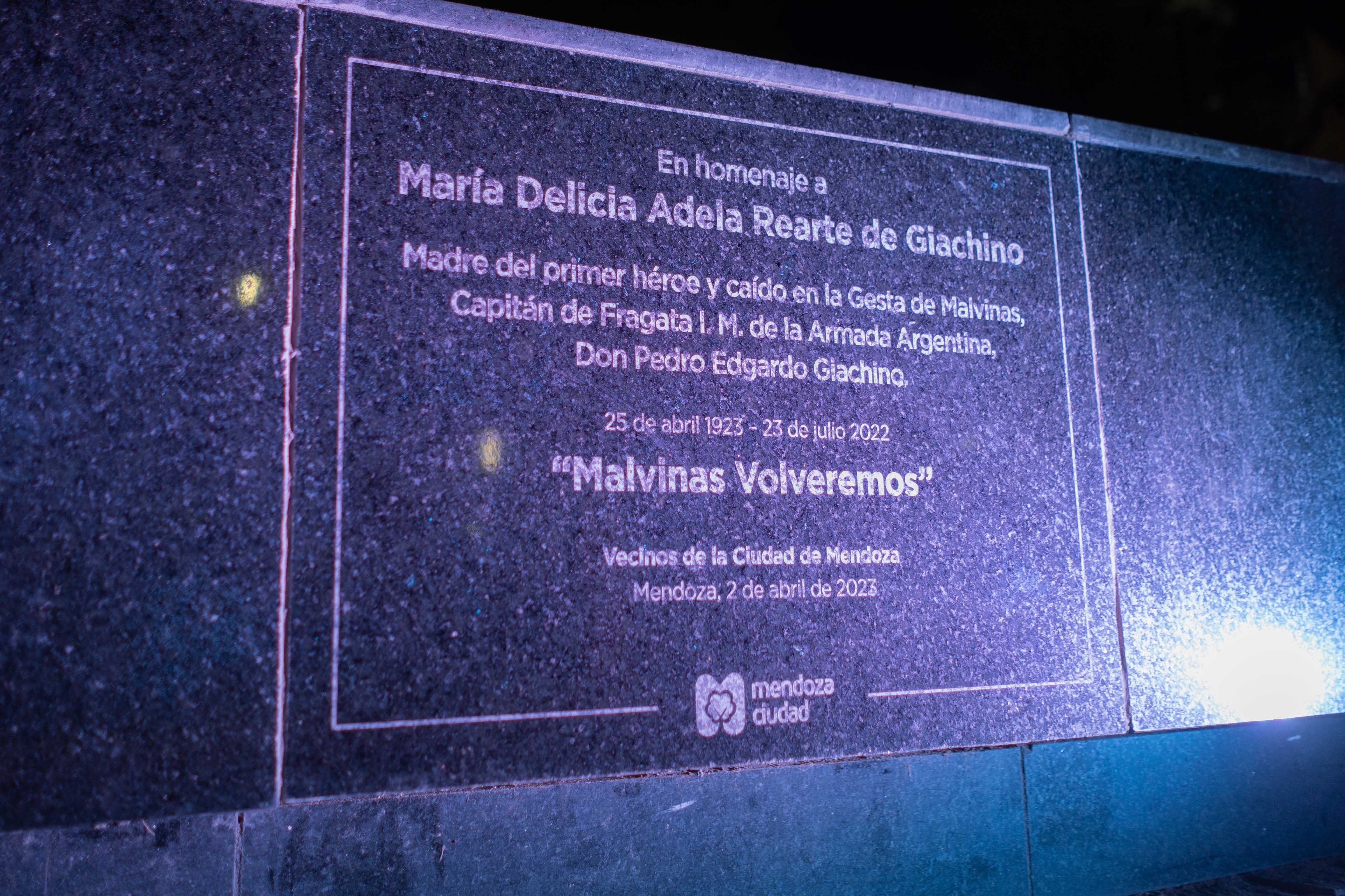 El intendente de la Ciudad también recordó a María Delicia Rearte de Giachino, por su amor, lucha y perseverancia. “María Delicia Rearte de Giachino está presente en esta plaza desde hoy y seguirá compartiendo el legado, no sólo de su hijo Pedro Edgardo sino de todos los caídos y veteranos, con los miles de mendocinos y turistas que recorren nuestra Ciudad todos los días y de la que ya es Ciudadana Ilustre”, manifestó, para luego entregarle a la familia el diploma de Ciudadana Ilustre de la Ciudad de Mendoza.
