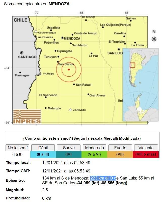 Según el Inpres, el movimiento telúrico ocurrió a las 2.53 de la mañana y el epicentro se identificó a 8 kilómetros de profundidad, a 55 kilómetros al sur de San Carlos y a 134 kilómetros de la Capital.