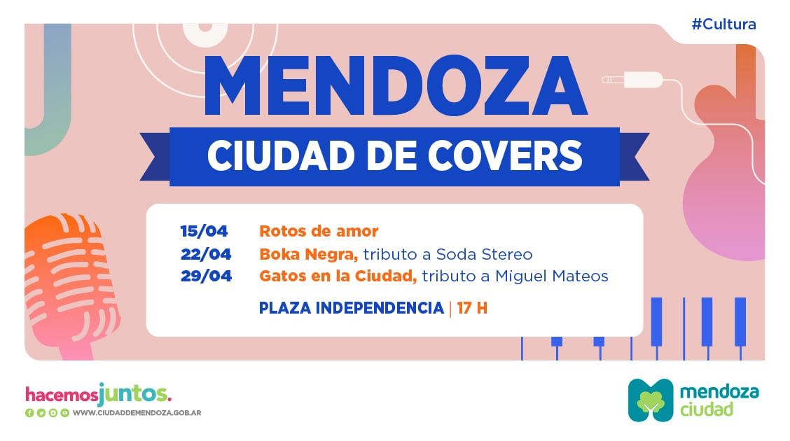 La Ciudad de Mendoza invita a vecinos, vecinas y turistas a disfrutar de “Mendoza, Ciudad de Covers”. Se trata de una propuesta musical que se realizará todos los sábados en la plaza Independencia, a partir del 15 de abril, siempre a las 17.