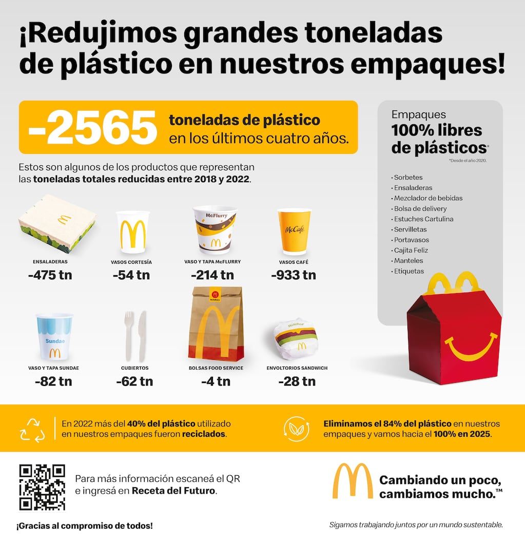 De acuerdo con Arcos Dorados, en 2022 también logró aumentar en 16% el uso de materiales reciclados en la fabricación de sus empaques; como en los portavasos, las bolsas y los empaques de cartón.