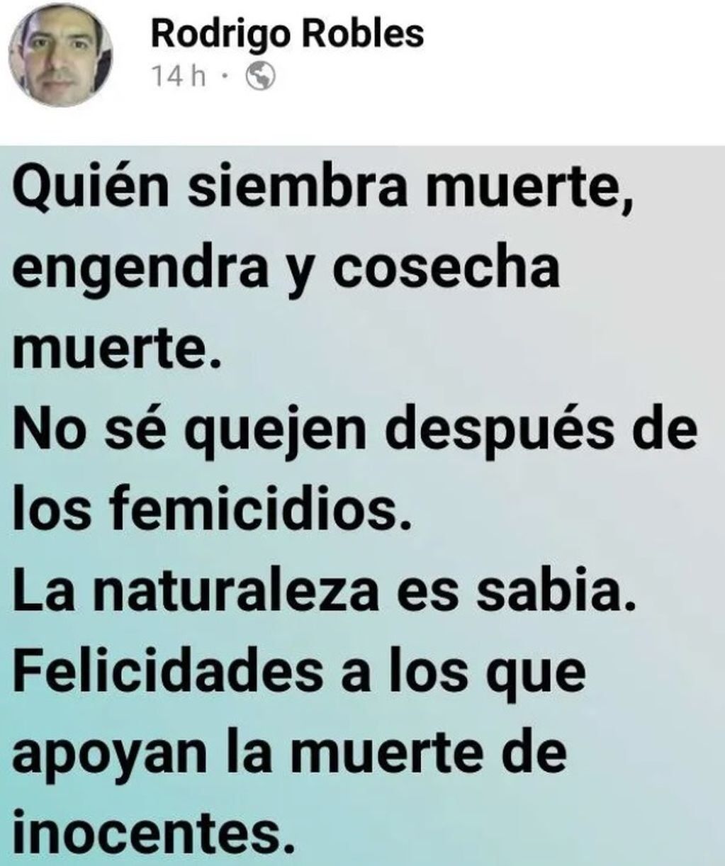 Se trata de Rodrigo Robles, un sacerdote que se desempeña en la localidad sanjuanina de Valle Fertil, según publica el Diario de Cuyo. El católico, enojado luego de que el Senado aprobara el aborto legal, escribió en su Facebook: “Quién siembra muerte, engendra y cosecha muerte. No se queje después de los femicidios. La naturaleza es sabia”.
